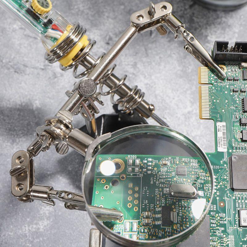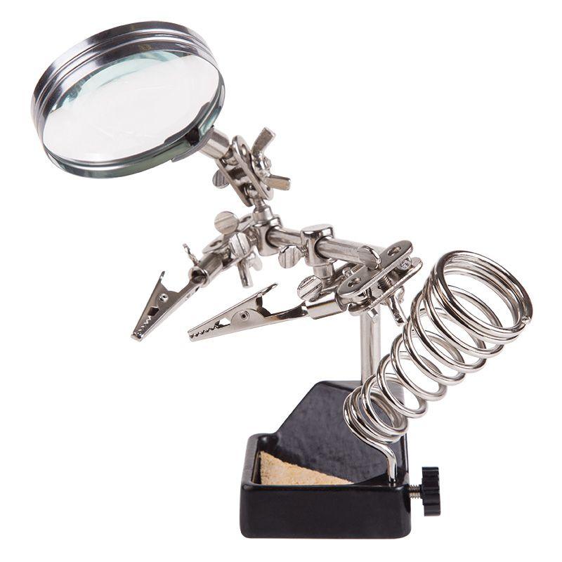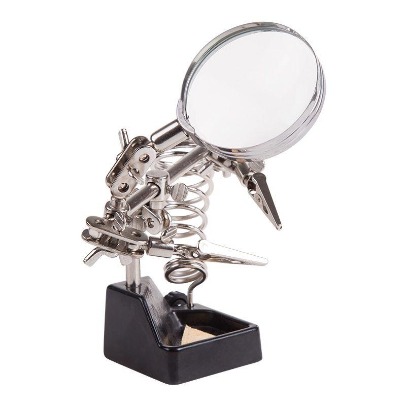 Держатель «третья рука» с лупой х2.5 REXANT служит главным образом при проведении паяльно-сборочных работ в электронике, ювелирном деле, сборке и ремонте для зажима мелких деталей в любом нужном положении, когда не хватает двух рук.