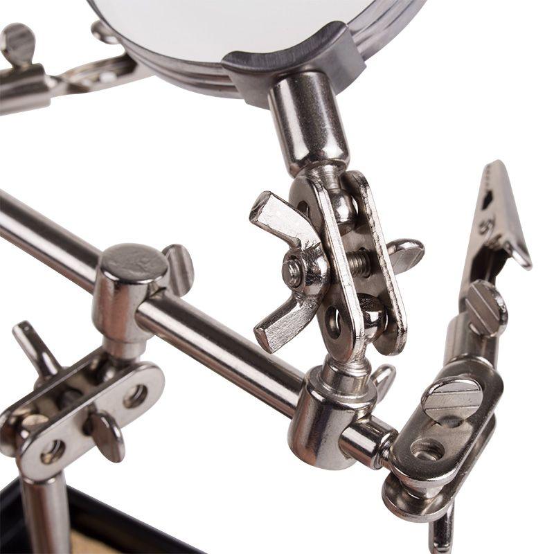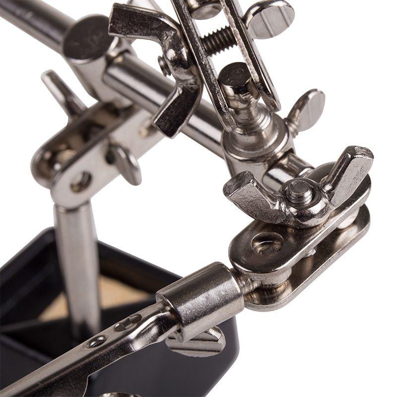Инструмент состоит из чугунного основания (тяжелая подставка с нишей для губки, мелких деталей или припоя), шарнирного соединения с зажимами типа «крокодил» (подвижных во всех плоскостях) с никелевым покрытием, лупы с 2.5-кратным увеличением (возможность регулировки положения, диаметр линзы 60 мм) и спиралевидной подставки под паяльник.