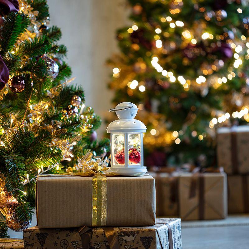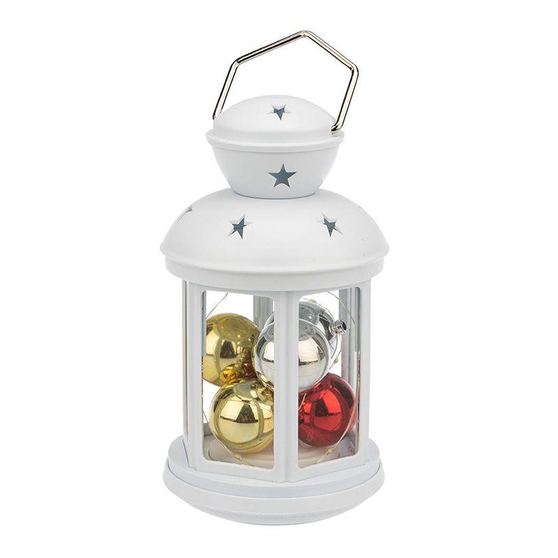 Декоративный фонарь представляет собой корпус белого цвета аутентичного исполнения, за стеклом находятся небольшие елочные шарики, подсвечиваемые диодной мини-гирляндой. 12 диодов излучают теплый белый свет и питаются от 2 батареек типа АА. Металлизированная глянцевая поверхность шариков эффектно играет в световом потоке, отбрасывая яркие блики на окружающие предметы. Светодиоды экономичны, безопасны и долговечны. Фонарь с шариками станет великолепным украшением праздничного и повседневного интерьера.